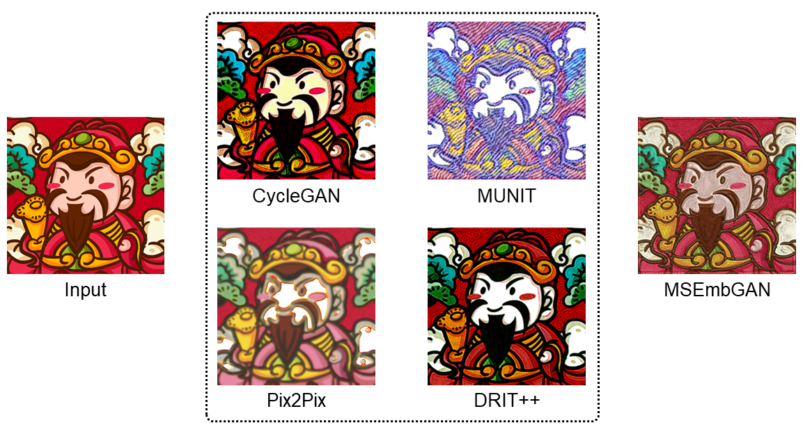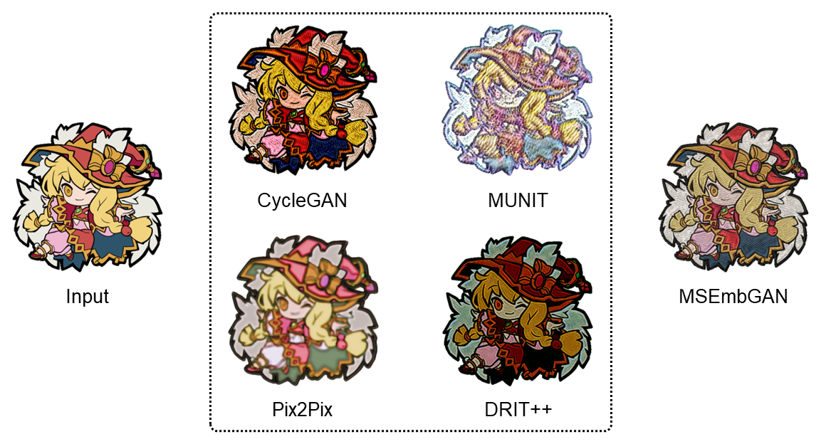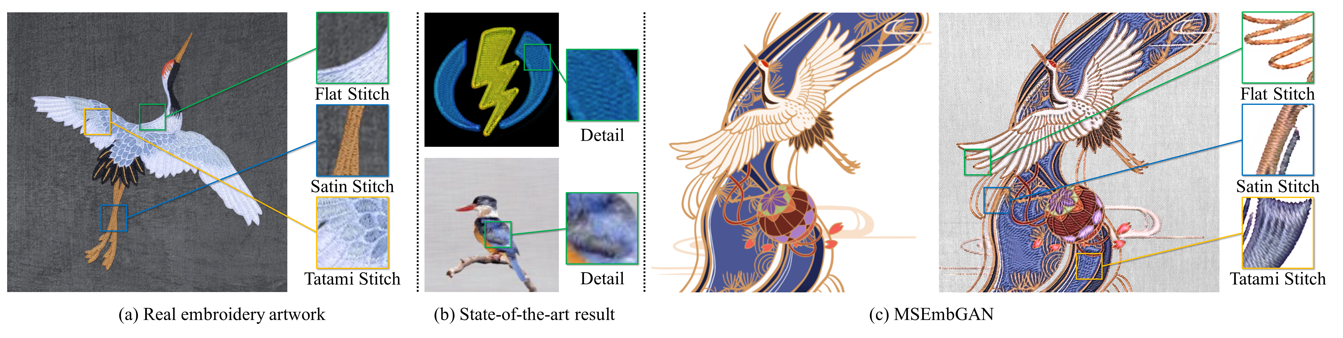 Convolutional neural networks (CNNs) are widely used for embroidery feature synthesis from images. However, they are still unable to predict diverse stitch types, which makes it difficult for the CNNs to effectively extract stitch features. In this paper, we propose a multi-stitch embroidery generative adversarial network (MSEmbGAN) that uses a region-aware texture generation sub-network to predict diverse embroidery features from images. To the best of our knowledge, our work is the first CNN-based generative adversarial network to succeed in this task. Our region-aware texture generation sub-network detects multiple regions in the input image using a stitch classifier and generates a stitch texture for each region based on its shape features. We also propose a structure generation network with a structural feature extractor, which helps achieve full image structural consistency by requiring the shape and color attributes of the output to closely resemble the input image. Because of the current lack of labeled embroidery image datasets, we provide a new multi-stitch embroidery dataset that is annotated with three single-stitch types and one multi-stitch type. Our dataset, which includes more than 30K high-quality multi-stitch embroidery images, more than 13K aligned content-embroidered images, and more than 17K unaligned images, is currently the largest embroidery dataset accessible, as far as we know. Quantitative and qualitative experimental results, including a qualitative user study, show that our MSEmbGAN outperforms current state-of-the-art embroidery synthesis and style-transfer methods on all evaluation indicators.