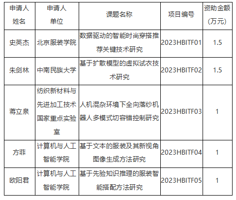 根据《纺织服装智能化湖北省工程研究中心开放课题申请与评审管理办法》,纺织服装智能化湖北省工程研究中心2023年度开放课题评审已圆满结束,感谢所有申请人对该开放课题的关注。经本工程研究中心学术委员会专家审议,拟对以下5项开放课题予以立项资助。