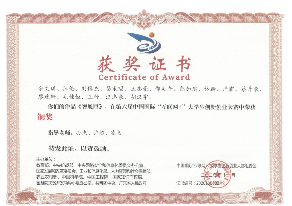 近日,由教育部等12部委和广东省人民政府共同主办,华南理工大学和广州市人民政府、深圳市人民政府联合承办的第六届中国国际“互联网+”大学生创新创业大赛总决赛圆满落幕。通过层层环节的角逐,由我院许超老师及经济学院孙杰、凌杰共同指导的,我院蔡升豪等同学及其它学院学生共同参与申报的大学生《智履匣》作品勇夺全国铜奖,取得学校参加该项赛事以来最佳成绩。