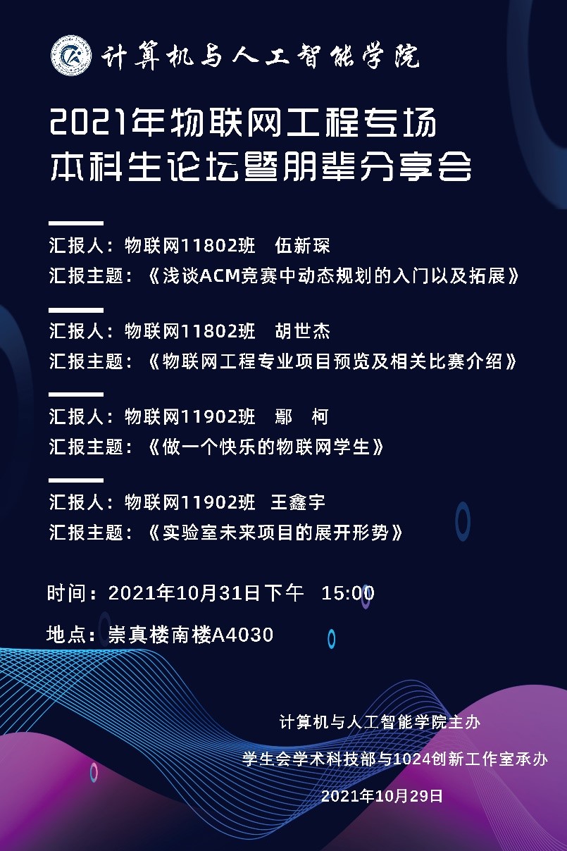 10月31日下午,Betvictor亚洲 2021年物联网工程专场本科生学术论坛暨朋辈分享会在崇真南楼A4030如期举行。本次论坛邀请了物联网专业2018级同学伍新琛、胡世杰和2019级同学鄢柯、王鑫宇分享学术和学科竞赛经验,学院党委副书记涂耀威、副院长魏雄及物联网工程系主任聂刚出席了本次论坛。