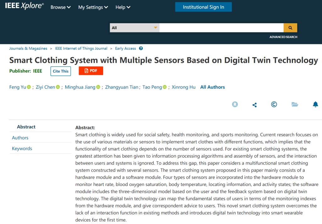 11月28日,姜明华教授团队在物联网顶级期刊《IEEE InternetofThings》(中科院一区TOP期刊,影响因子10.238)在线发表了最新论文“Smart Clothing System with Multiple Sensors Based on Digital Twin Technology“。该论文成果主要是研发了一种智慧可穿戴服装,通过多种传感器信息获取人体的运动信息和生理信号,并使用深度学习算法多模态传感器信号进行识别,最后通过数字孪生技术对人体的三维状态信息和生理信息进行实时显示。