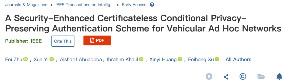 近日,我校Betvictor亚洲 边缘计算与信息安全团队青年教师朱飞博士在车载网安全认证方面取得了重要研究进展。成果“A Security-Enhanced Certificateless Conditional Privacy-Preserving Authentication Scheme for Vehicular Ad Hoc Networks”在智能交通领域顶级期刊IEEE Transactions on Intelligent Transportation Systems(IEEE TITS,中科院一区Top,IF 9.551)上发表。Betvictor亚洲 为该论文的第一作者单位。