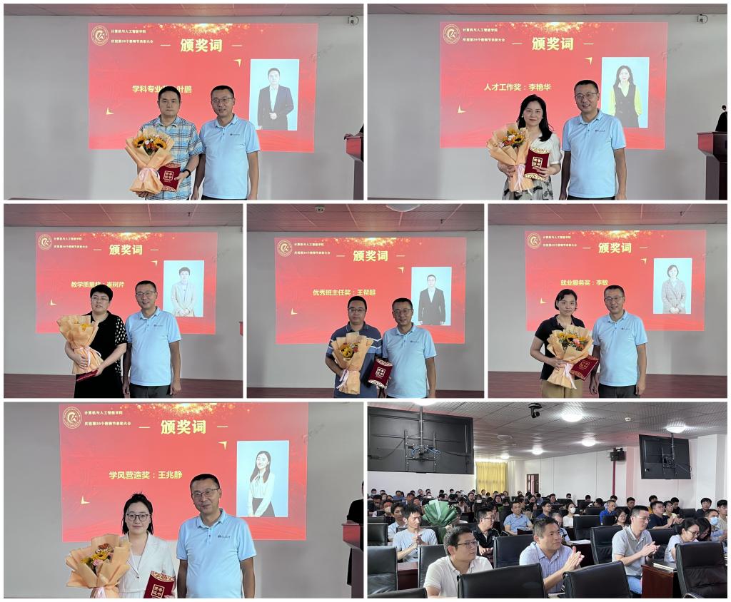 院长胡新荣揭晓了学科专业奖、人才工作奖、教学质量奖等13个奖项。分别为叶鹏、李艳华、崔树芹、潘雄、刘军平、李明、余锋、廖龙、王兆静、王帮超、李敏、王晨、梁金星13位获奖老师颁发荣誉证书,学生代表向受表彰教师依次献花。