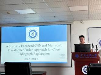林泽平同学分享的主题是“A Spatially Enhanced CNN and Multiscale Transformer Fusion Approach for Chest Radiograph Registration”,他指出,随着深度学习在医学影像配准领域的发展,可变形医学图像配准研究在图像分析和临床领域中至关重要,通常依赖于卷积网络来创建 U 形网络。然而,由于卷积网络的接受场有限,传统方法在配准具有很大差异的图像时可能效果较差。所以他们提出了一种将卷积网络与注意力机制相结合的混合方法,利用注意力机制的远程建模能力来解决上述挑战。首先,他们设计了一个多尺度变换器融合模块 (MTF),并将其集成到 U 形网络的跳跃连接中,增强了空间关系建模。其次,提出了一个即插即用的配准头,用于变形场生成中的位置参考。此外,为了提高胸部 X 光片中的肺部配准精度,还设计了一个名为肺部区域损失的新损失函数。与当前方法相比,他们的混合方法在三个基准数据集上的平均 Dice 相似度得分 (DSC)、豪斯多夫距离 (HD) 和平均对称表面距离 (ASSD) 方面显示出显著改善,并证明了其在医学图像配准中的有效性。