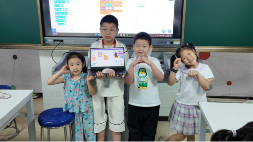 为提升课堂趣味性与协作能力,实践团将全班划分为五个小组,引导学生组内互助、协作完成挑战任务。在互动与演示环节,孩子们积极展示自己的程序作品,展现出出色的表达力与逻辑思维。根据课堂表现、作品完成度、互动积极度等综合评分,第五组最终获得本次课程积分排名第一名。其中,王一州与郭云泽两位小朋友表现尤为突出,逻辑清晰、反应敏捷,并在课堂演示中带动小组团队不断优化程序细节,赢得在场老师与小朋友们的阵阵掌声。