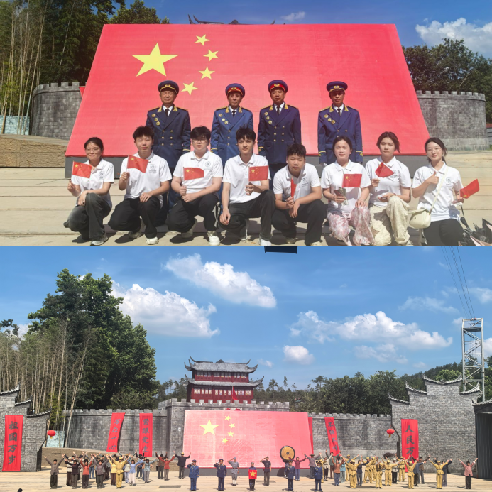下午,实践团转赴七里坪镇将军红教育基地,观看大型实景剧《红安永远红》。该剧以戴氏兄弟革命故事为主线,通过120名演员的倾情演绎,再现了红安人民“铜锣一响,四十八万”的壮烈历史。剧中“戴大哥”高举红旗高呼“红安永远红”的场景,令成员孙艺文潸然泪下。演出尾声,全体演员与观众合唱《歌唱祖国》,骄阳下红旗飞扬,将现场气氛推向高潮。“30分钟的演出,让我读懂了红安为何能走出223位将军。”成员李维一在笔记中写道,“这片土地上的每一句口号、每一面红旗,都镌刻着‘九死不悔’的忠诚。”