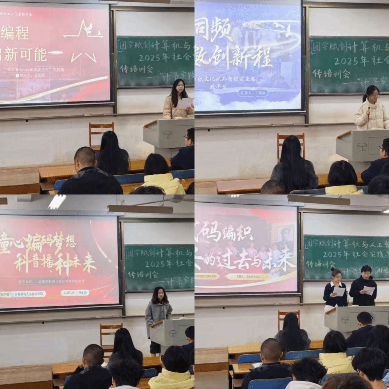 在宣讲环节,四个优秀实践团队依次登台,分享他们的实践历程与成果:智汇社区实践团围绕、锦绣织语实践团、智启童心实践团、智绘红图实践团通过生动的案例、详实的数据和精彩的展示,分享了在社区服务、文化传承、儿童教育、红色文化传播等不同领域的实践经历、创新做法与宝贵收获,为在场学生提供了丰富的实践参考与启发。