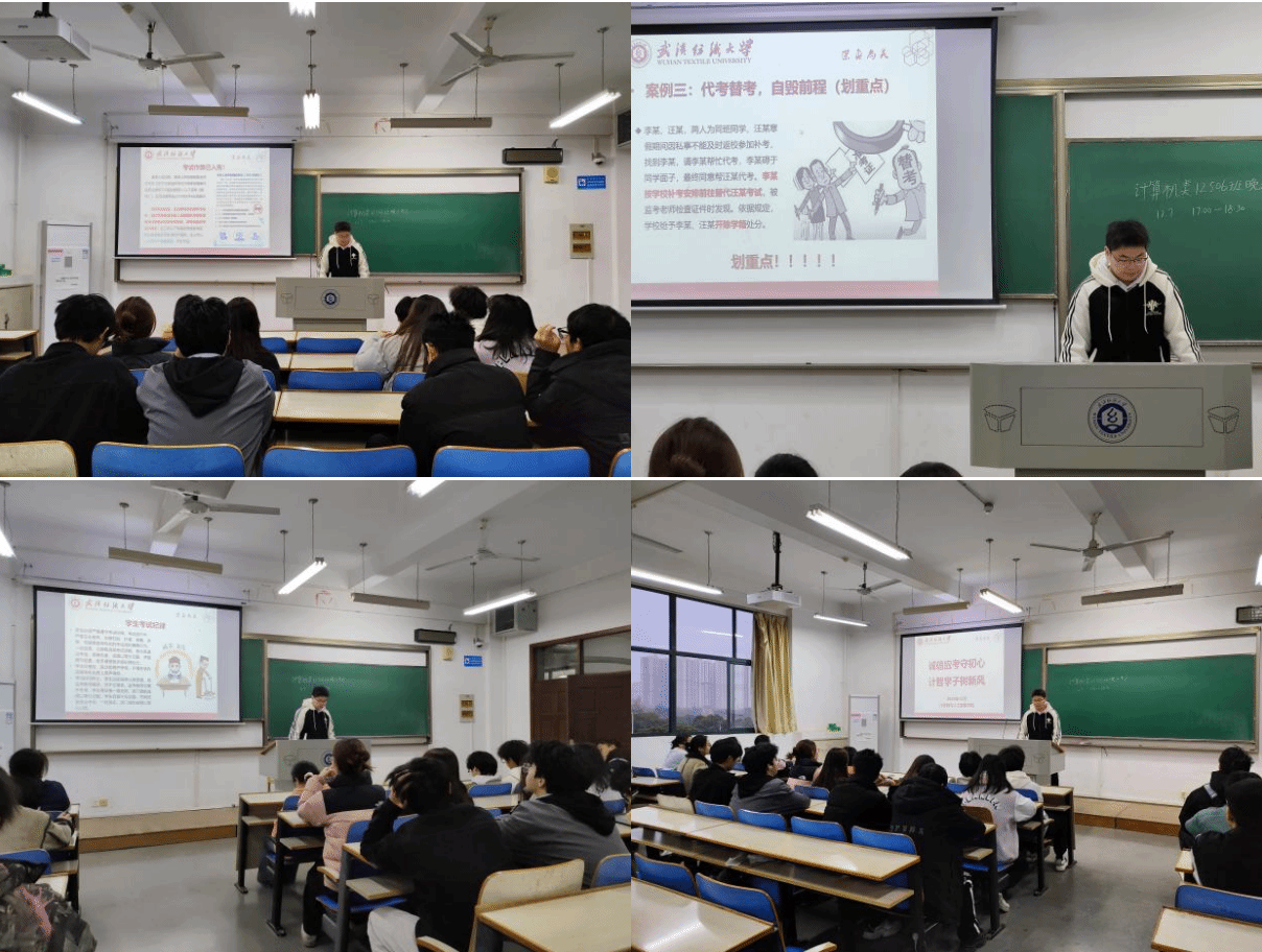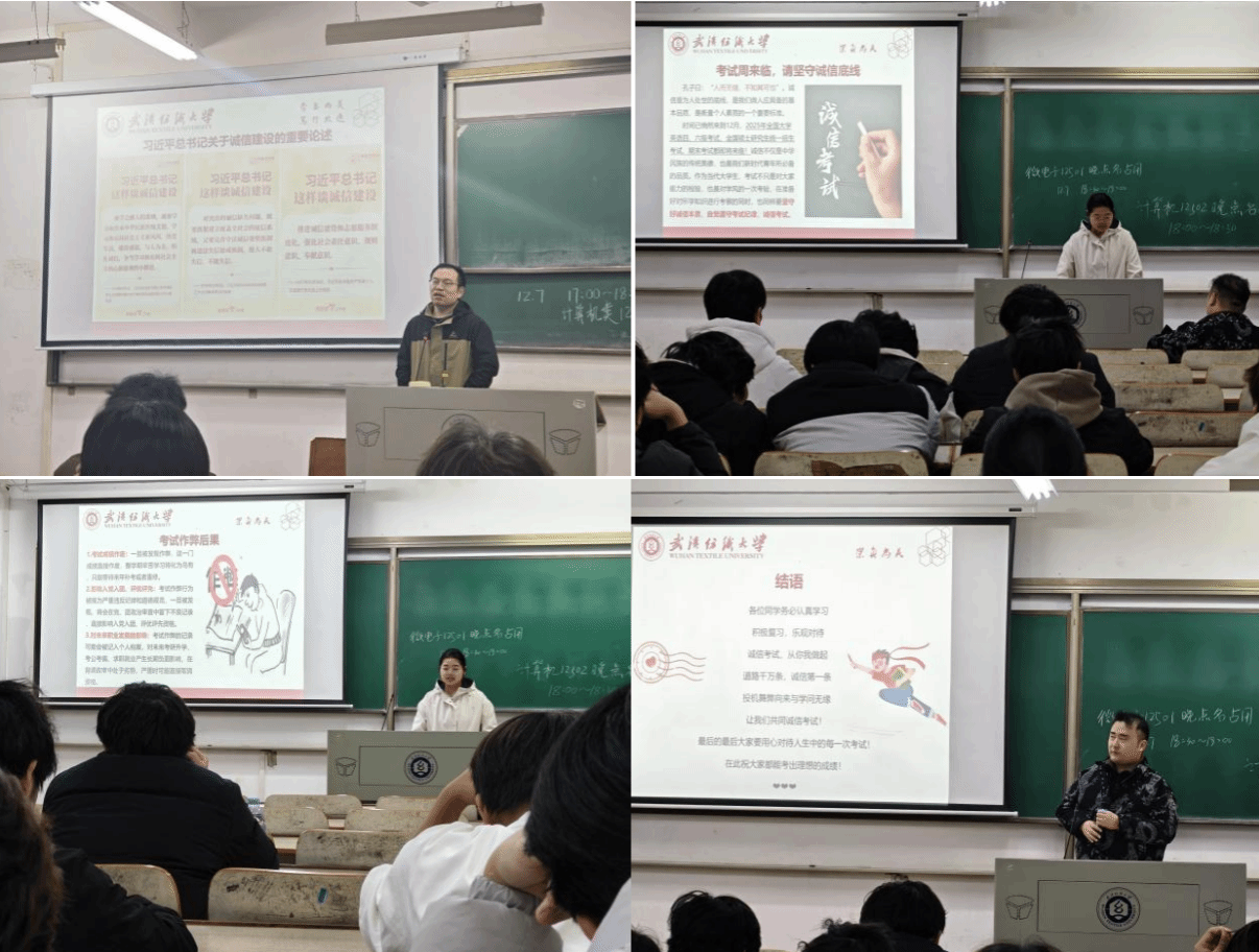 班会伊始,首先完成晚点名工作,精准掌握学生返校动态,对未返校同学逐一联系、确认行程,把安全管理落到细节。随后重点学习深入学习习近平总书记关于诚信建设的重要论述,明确诚信是中华民族传统美德、社会主义核心价值观的重要内涵,也是新时代青年立身行事的根本准则,理解“诚信应考是科学精神的必然要求”,将诚信从道德要求转化为行动自觉。了解《中华人民共和国教育法》中考试作弊的法律后果,明确“组织考试作弊”“代替考试”等行为已入刑,认识到作弊不仅是违纪,更是违法行为。系统学习《武汉纺织大学学生考试违纪处理办法》,明确考试违纪、作弊等行为对应的处分,以及处分对学位、毕业、升学的影响。