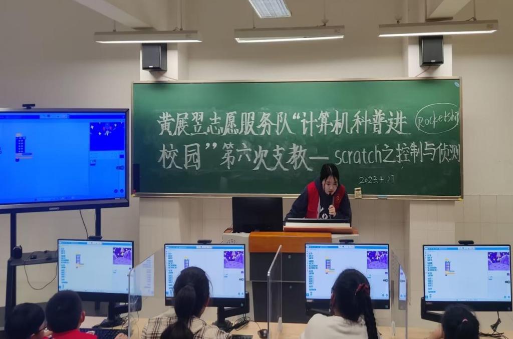 “志愿者哥哥姐姐们又来给我们上课啦,快坐好。”武汉纺织大学黄展翌志愿服务队的志愿者们又和武昌区石洞街学校的孩子们相见了。4月27日下午,“计算机科普进校园”系列活动如约而至,这是志愿服务队第六次在武昌区石洞街学校开展支教活动。按照原定的安排和计划,继续为石洞街学校的孩子们带来了有趣的计算机知识科普和scratch编程教学。