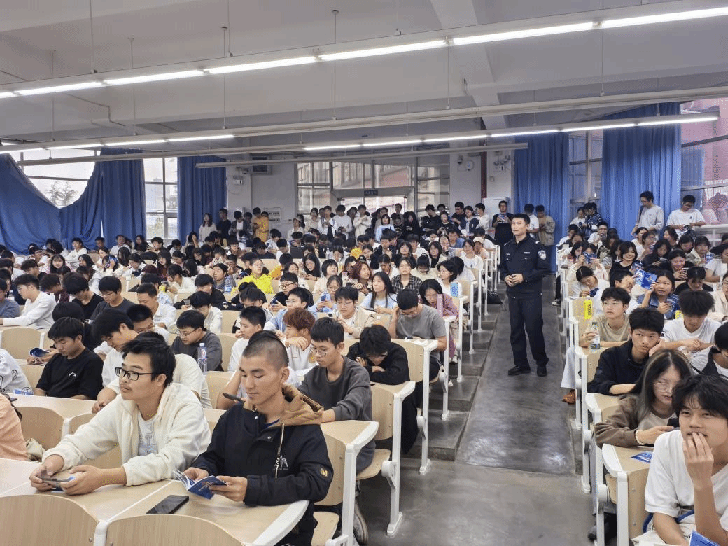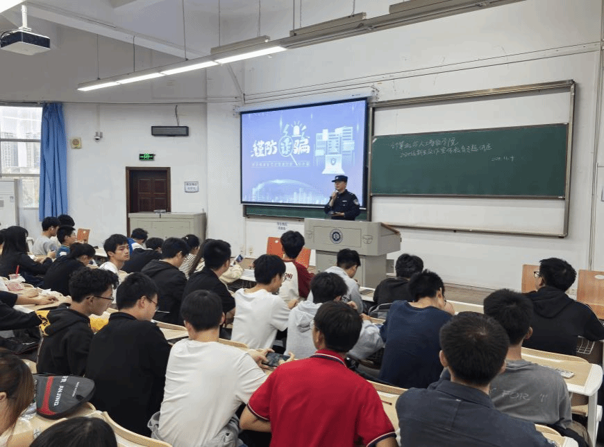 近年来,随着互联网的普及和社会经济的快速发展,诈骗活动日益猖獗,严重威胁着人民群众的财产安全和社会稳定。诈骗分子的手段越来越多样化,从传统的电话诈骗、短信诈骗,到现在的网络诈骗、社交软件诈骗等,让人防不胜防。为提高广大师生的反诈能力,Betvictor亚洲 于11月4日开展了反诈宣讲会,本次宣讲会由纸坊派出所邓警官主讲,2024级本科生辅导员、全体新生共同参与。