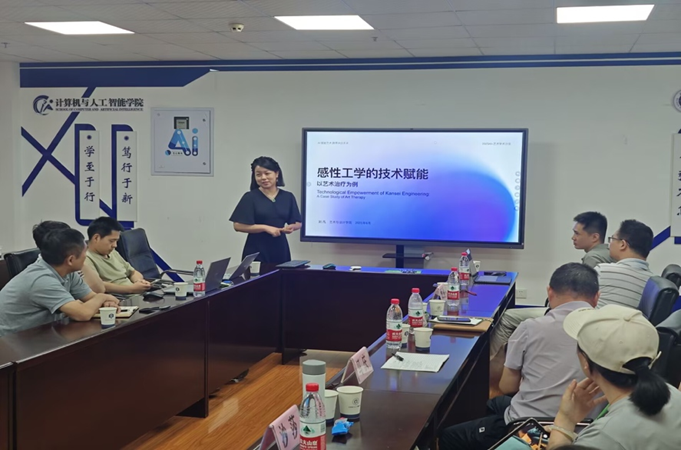 艺术与设计学院副院长刘凡教授以《感性工学的技术赋能》为题,详细介绍了感性生理学、感性信息学、感性工学创作的内涵。她以指导学生发表的《基于纺织纤维媒介的留守儿童情绪调节路径研究》论文为例,从艺术治疗理论与发展史、留守儿童心理问题及干预现状、纺织纤维艺术治疗理论基础与心理机制等方面,展示了技术与人文关怀的深度融合。