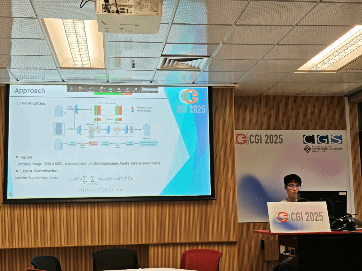 的研究生张文豪和郑思成受邀参会,并于7月16日和17日分别在分会场和主会场进行了论文宣讲。郑思成同学的论文《MIGEdit: Multimodal Interactive Garment Editing》聚焦于多模态交互服装编辑技术,提出了一种创新的编辑方法,旨在提升虚拟服装设计的交互性和实用性。