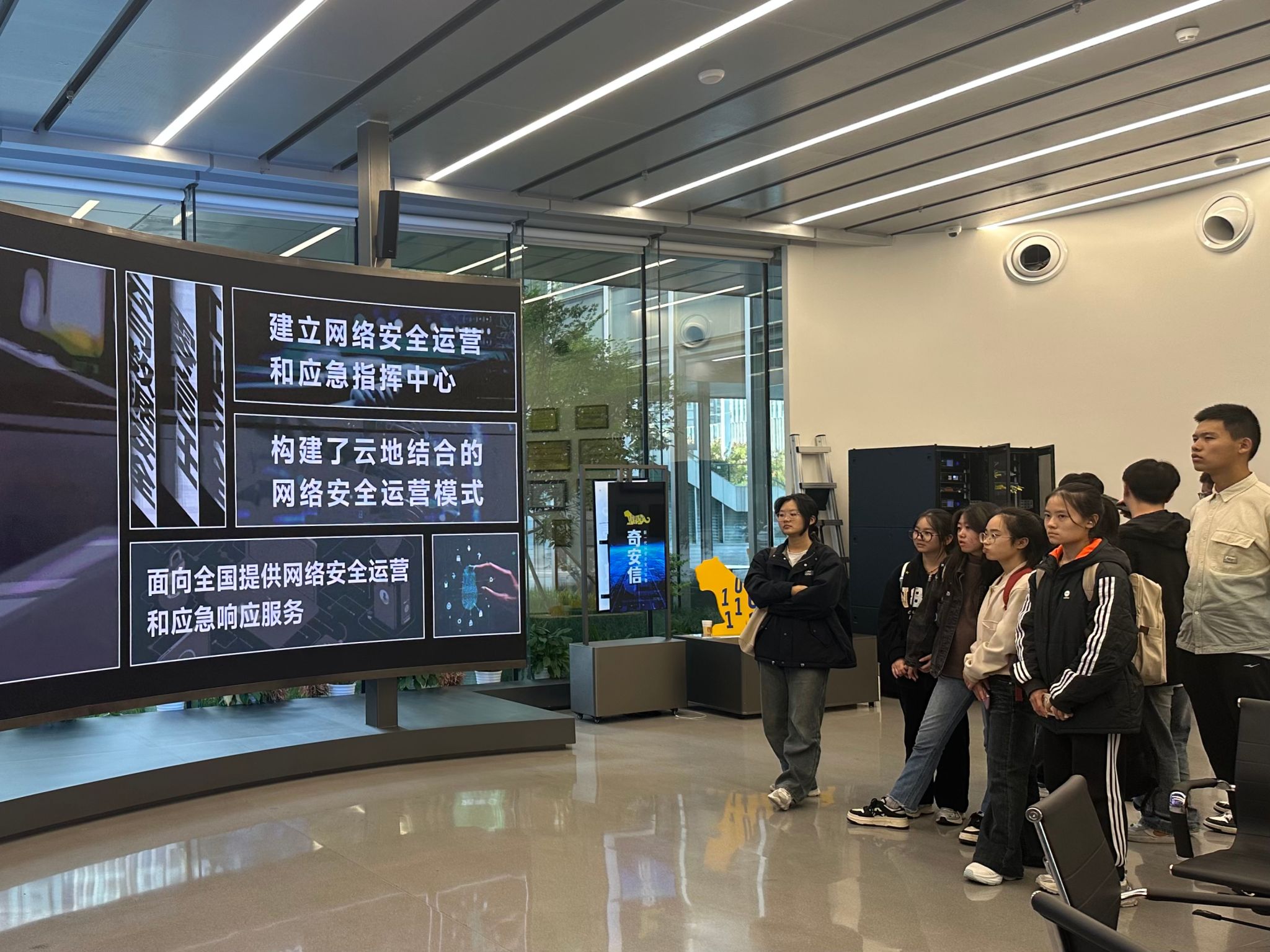 随后,在卢雨的带领下,同学们参观了网络空间安全展示中心。展示中心内,丰富的案例和互动体验让同学们沉浸其中。大家亲眼目睹了网络安全领域的最新技术成果,包括关键信息基础设施防护体系、动态防御机制等前沿内容。通过工作人员的详细讲解,同学们对网络安全的实战化、体系化、常态化特点有了更为直观的认识。一位新生在参观后表示:“这次参观让我对网络安全有了全新的认识,原来它不仅仅是课本上的理论知识,更是关乎国家安全和社会稳定的重要领域。”