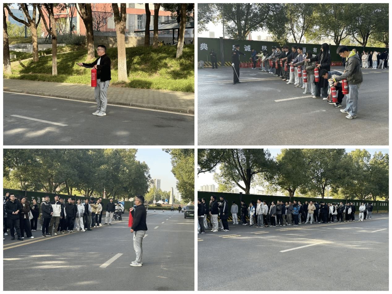 讲座结束之后,在保卫处领导老师的指导下开展实操演练环节。首先,由专业人员讲解灭火器的使用方法,并现场示范了灭火器“提、拔、握、压”的正确操作步骤,再由同学们十六人一组分组进行实操练习。