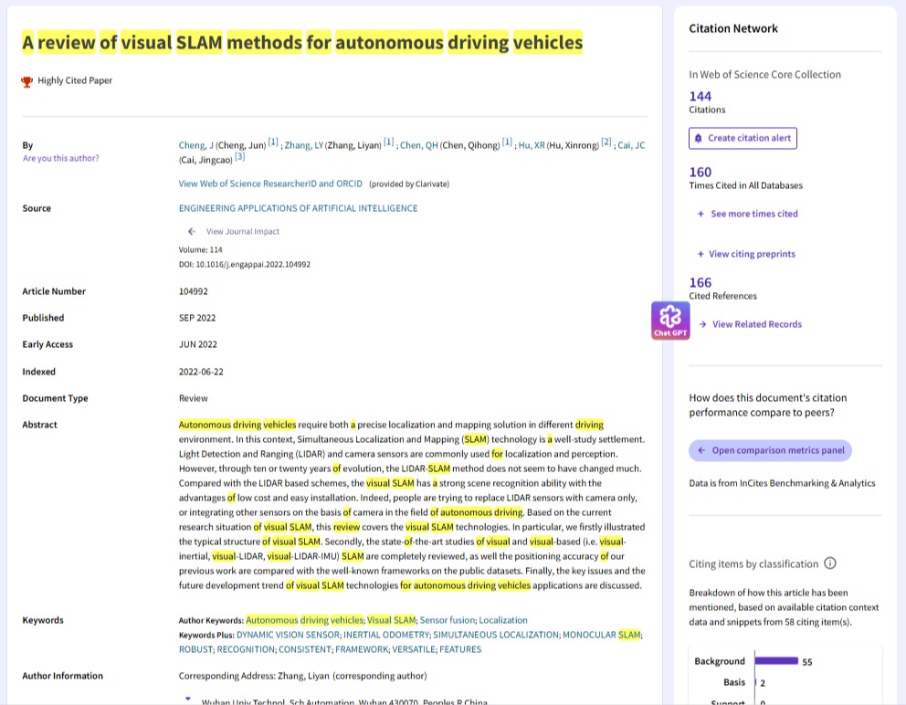 程君博士的论文《A Review of Visual SLAM Methods for Autonomous Driving Vehicles》聚焦无人驾驶核心技术之一的视觉SLAM(同步定位与地图构建)。该研究系统梳理了该技术从传统方法到深度学习融合方案的发展脉络,创新性地构建了“技术演进-性能对比-场景适配”三维分析框架,深入剖析了动态环境、光照变化等核心挑战,并对未来复杂城市场景与多车协同定位的研究方向进行了前瞻预判。论文发表于人工智能领域权威期刊《Engineering Applications of Artificial Intelligence》(SCIE Q1区TOP),已被引超过160次,引用学者覆盖全球20余个国家和地区,包括清华大学、慕尼黑工业大学、丰田研究院等知名机构,为自动驾驶技术的工程化落地提供了关键学术参考。