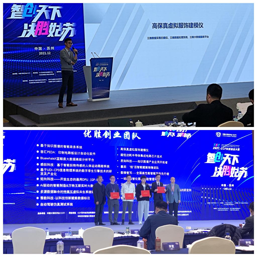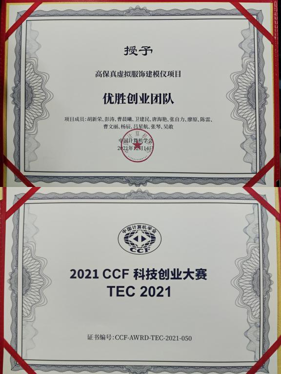 2021年9月,CCF首届科技创业大赛开始征集项目,受到广泛关注,来自19个省41个市的80多所高校、科研院所及创业公司积极报名,共有102个队伍参加比赛,其中不乏有清北等重点高校项目。最终经过评委会两轮评审,我院胡新荣教授项目“高保真虚拟服饰建模仪”成功入选,进入决赛。在决赛场上,胡新荣教授项目“高保真虚拟服饰建模仪”与清北等计算技术各领域的优秀创业团队竞争,经过激烈竞争,成功获得2021 CCF 科技创业大赛 TEC 2021 优胜奖。