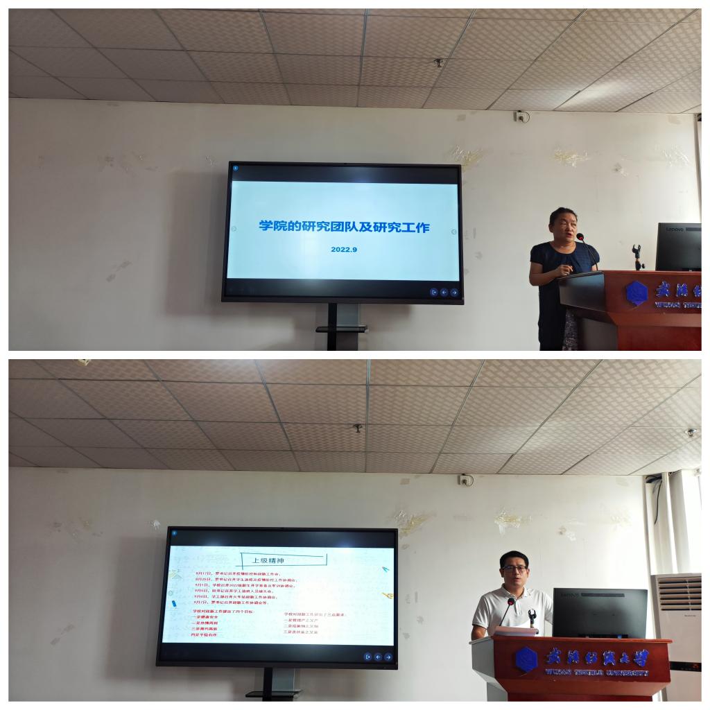 院长胡新荣对受表彰的老师给予了高度赞扬,鼓励更多老师积极向标兵教师标准看齐。并就学院的研究团队及研究工作进行了重点发言,根据行业发展和学校优势学科,将学院的研究领域凝练为可视计算与数学纺织,并根据学院教师实际研究背景,划分了移动感知与智能穿戴、跨媒体计算与数字孪生、自然语言处理与知识图谱、数据治理与智能时尚、边缘计算与信息安全五个研究方向。就五个研究方向分别详细地介绍了前沿的研究成果及研究现状,鼓励各位老师根据自己的兴趣,找准研究方向,加入研究团队,号召老师们不要单打独斗,闭门造车,学会合作共同为学院的科研事业努力奋斗。党委副书记向涛就9-10号的迎新工作安排做了详细部署与安排,动员学院全体教职工为接下来的两天迎新工作共同出力,以顺利完成迎新工作。