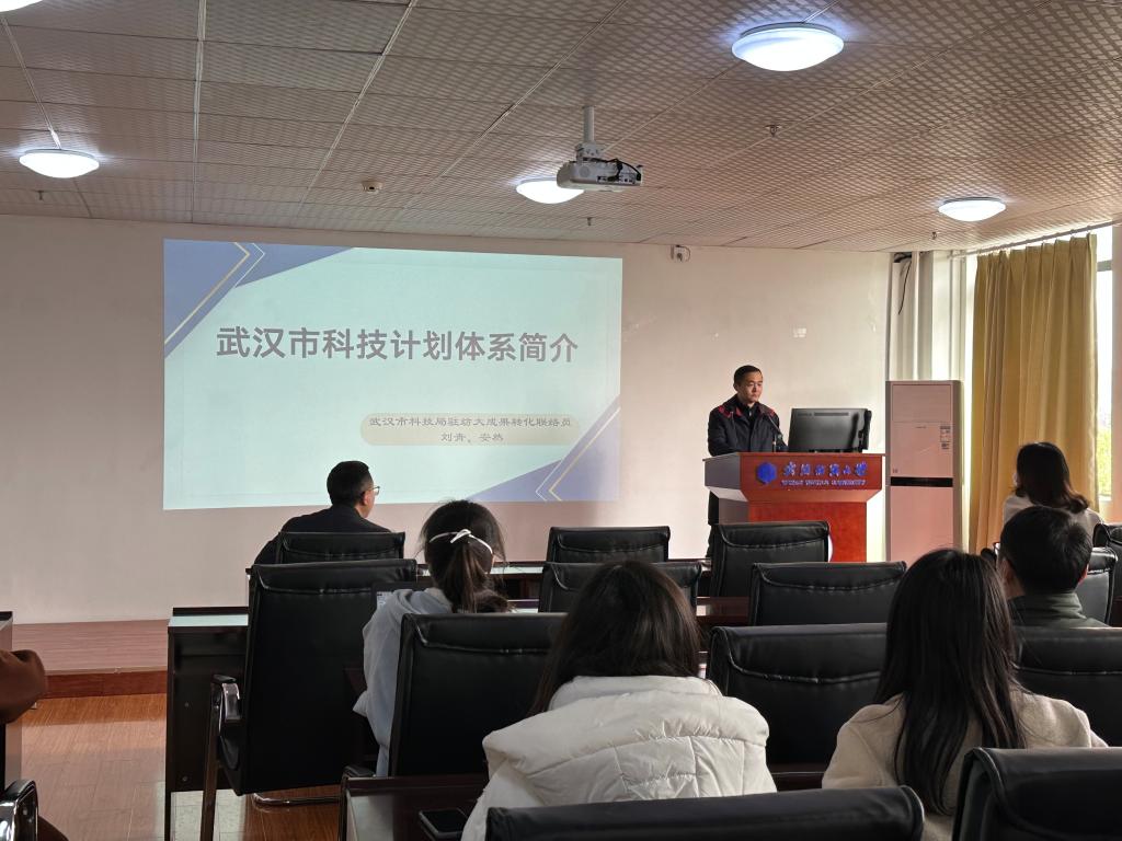 3月2月下午14点,武汉市科技局驻纺大成果转化联络员刘青主任、安然主任受邀来我院开展科技计划体系专题讲座,该讲座由学院党委书记晏伟主持,学院领导班子、科研团队负责人及骨干教师共同参加了该讲座。