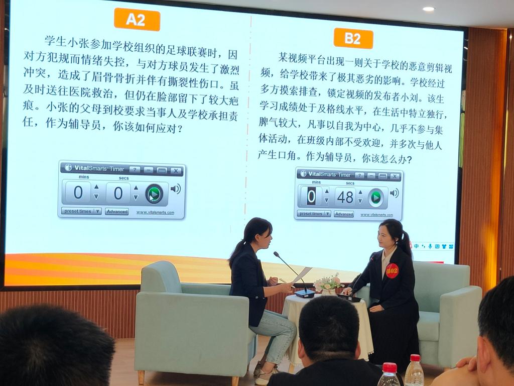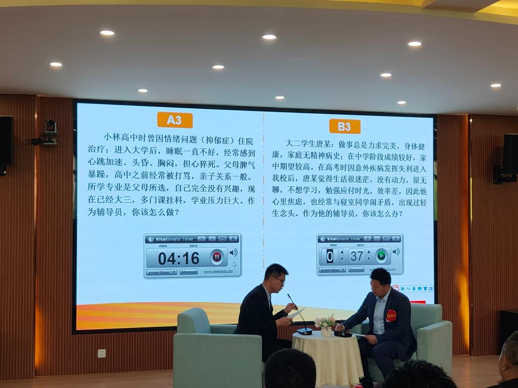 谈心谈话环节,通过还原辅导员在面对学生时的真实情景和工作情境,现场展示了辅导员们利用自身工作经验,循循善诱,切实帮助学生解决各类问题的过程,展现了辅导员与学生点滴交往时的工作魅力。