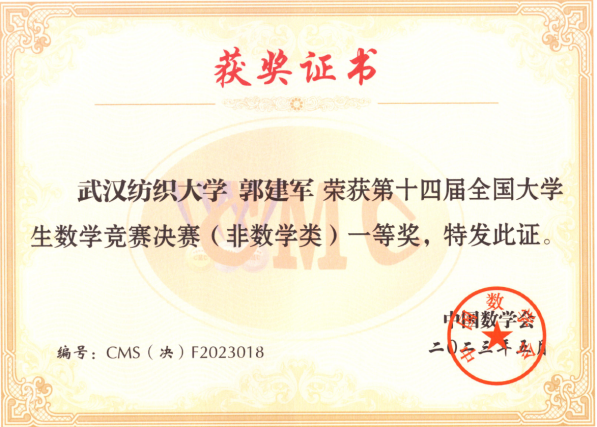 5月26日至28日,第十四届全国大学生数学竞赛决赛在广东工业大学成功举行,来自全国32个赛区的905名学生参加比赛。决赛由中国数学会主办、广东工业大学和广东省数学会承办。经过激烈角逐,Betvictor亚洲 计算机11903班郭建军同学荣获第十四届全国大学生数学竞赛非数学类全国一等奖,决赛成绩位列全国第十八名、湖北省第二名。