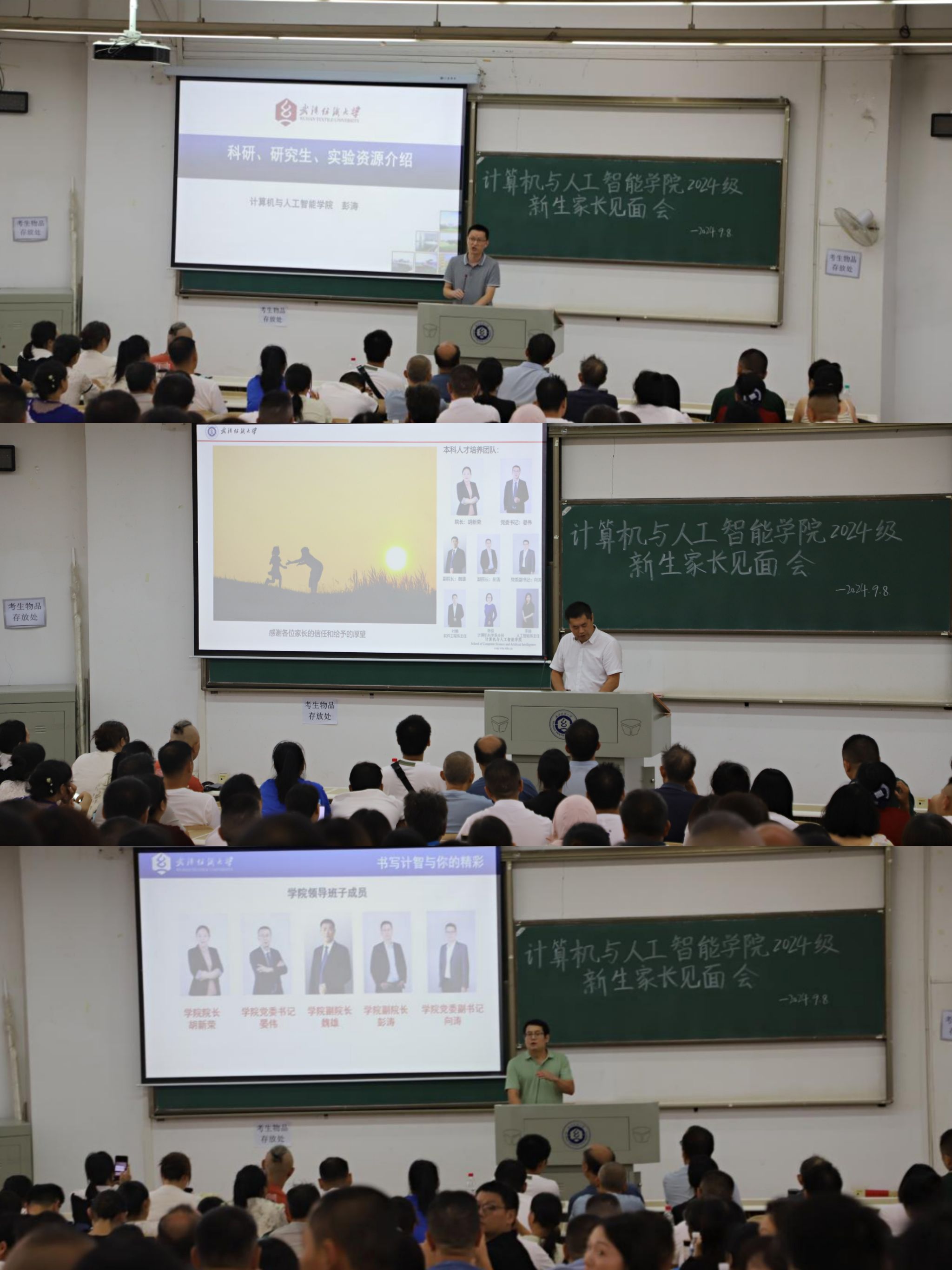 是个什么样的学院”为切入,详细介绍了学院各个专业培养方案和课程学分要求。他指出学院通过完善的人才培养体系,为学生大学四年学什么、做什么提供了细致的指导。彭涛从五大科研团队和各项科研成果介绍了学院科研情况;从研究生生源情况、导师团队、科研氛围、研究生科研成果等方面介绍了学院研究生培养情况;从实验室场地、创新实践基地、学习平台等介绍了实验室资源。向涛从“三支队伍”“四个循环”“五项工作”三方面向各位家长介绍学院学生工作情况。并承诺对学生做到共理、共情、共声、共向;对工作做到人到、心到、情到、责到,让家长对学院充满信心,对孩子更加放心。