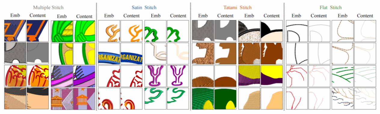 课题组通过专业的刺绣软件 (Wilcom 9.0) 制作了超过3万的图像,包括刺绣图像和相应的内容图像。并且所有图像都被调整为256×256的分辨率。多针刺绣数据集将开源,贡献给本研究领域的其他研究者。